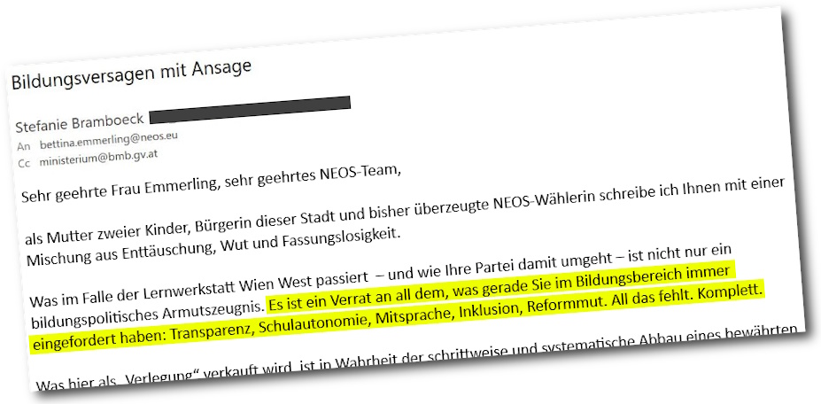 als Mutter zweier Kinder, Bürgerin dieser Stadt und bisher überzeugte NEOS-Wählerin schreibe ich Ihnen mit einer Mischung aus Enttäuschung, Wut und Fassungslosigkeit.